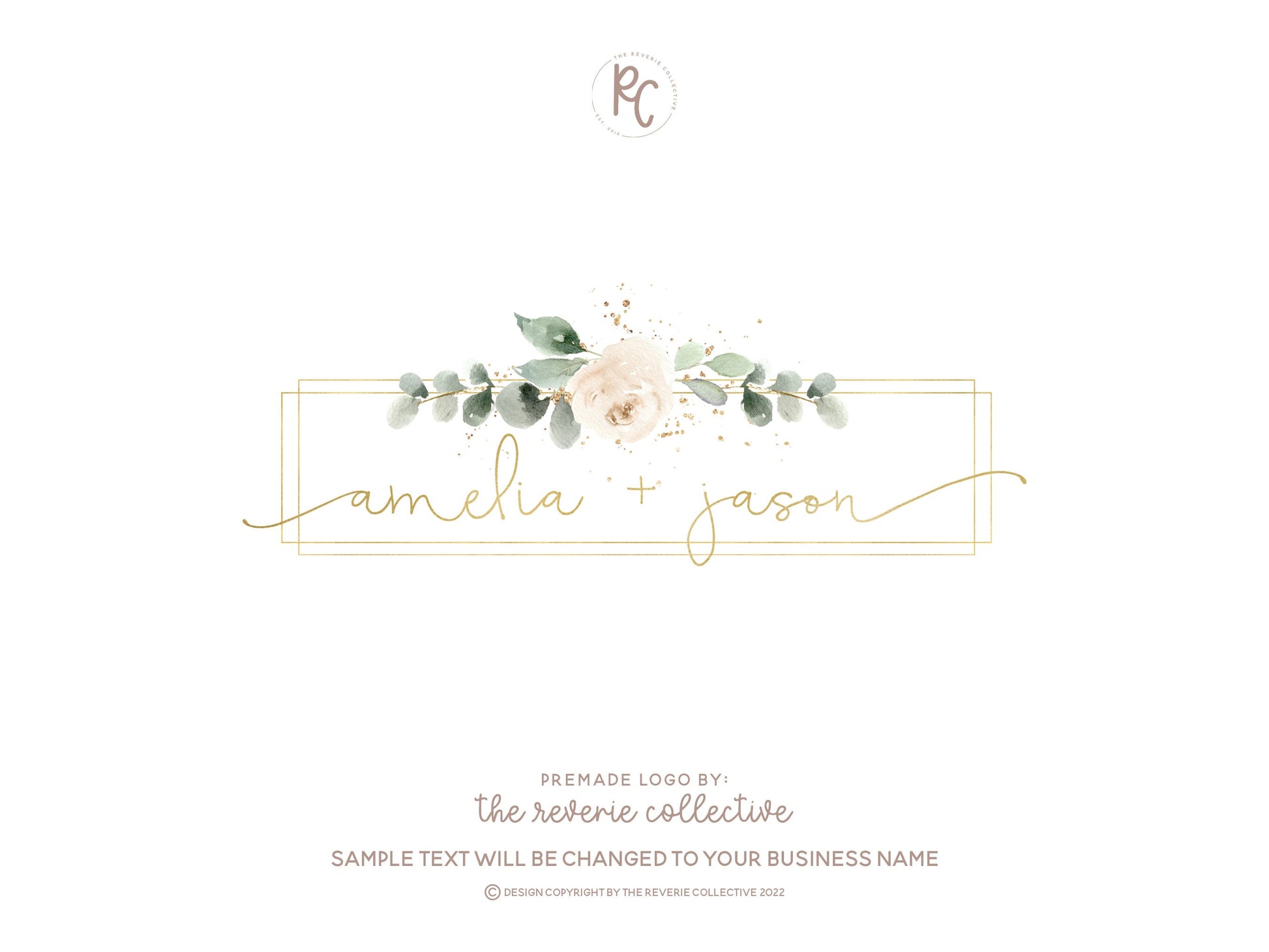 Amelia + Jason | Premade Logo Design | Floral, Wedding, White Rose, Gold Frame