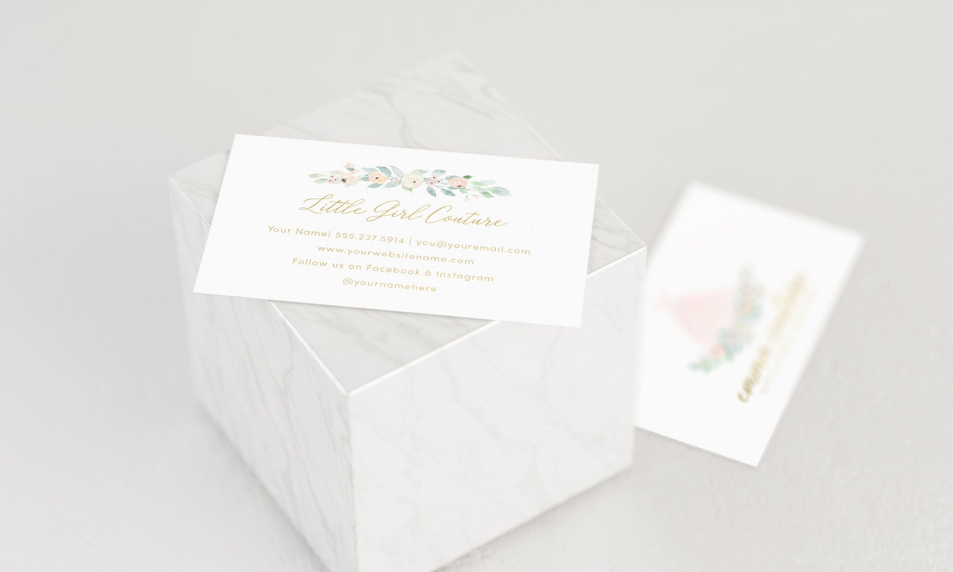 This premade business card design in a girl pink floral dress style is a quick and affordable way to print out fresh, new business cards either at home or online!