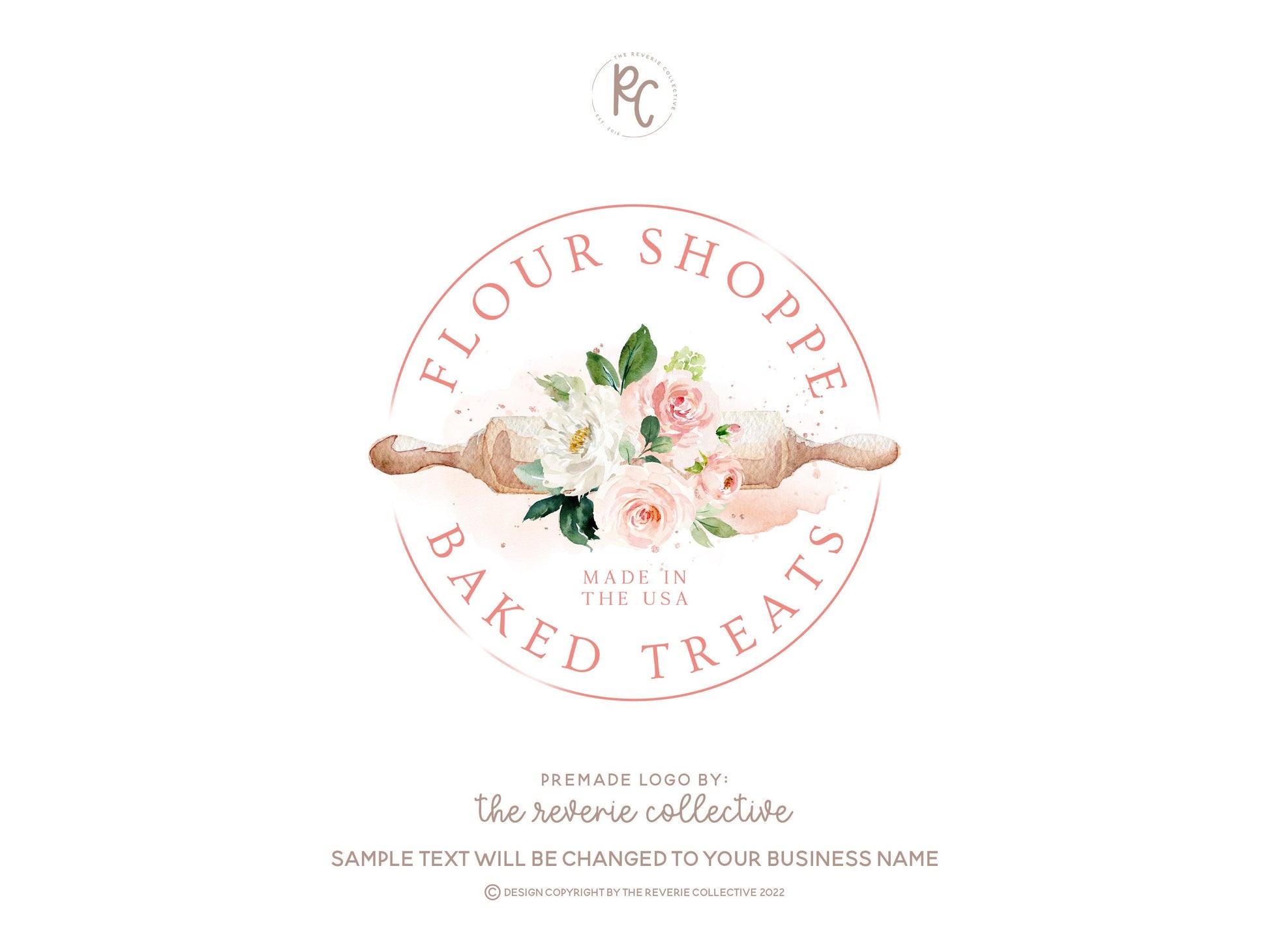 This premade logo design in a girly pink floral rolling pin style is a quick and affordable way to launch your business in just a few days!