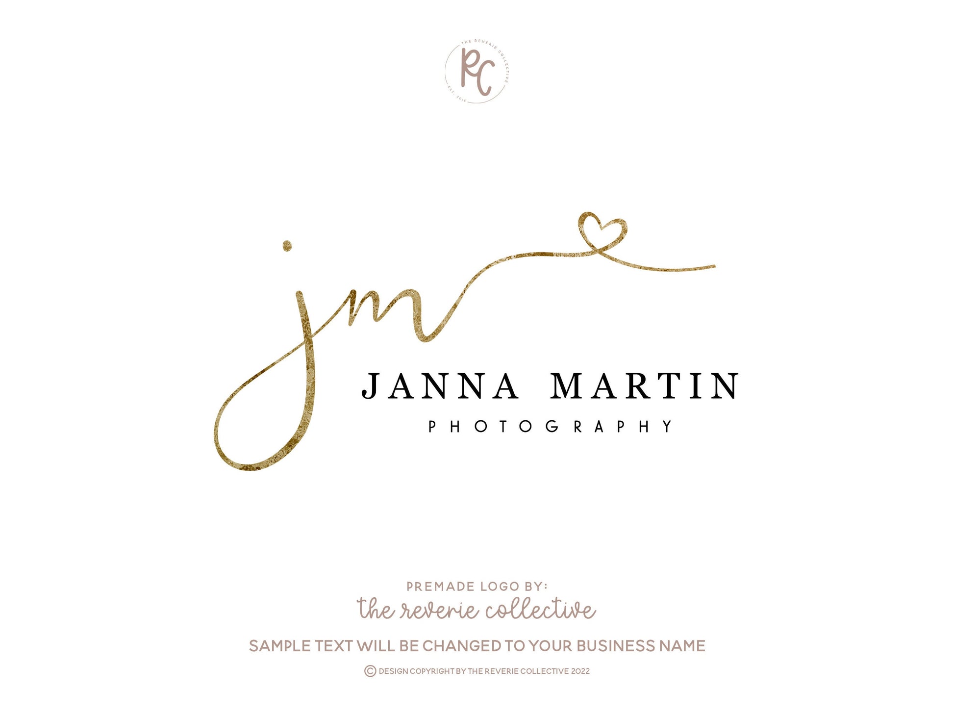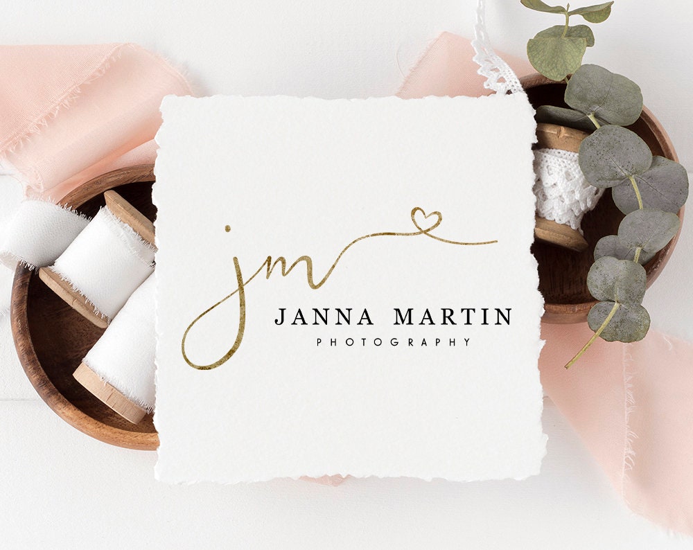 This premade logo design in a gold foil monogram heart style is a quick and affordable way to launch your business in just a few days!