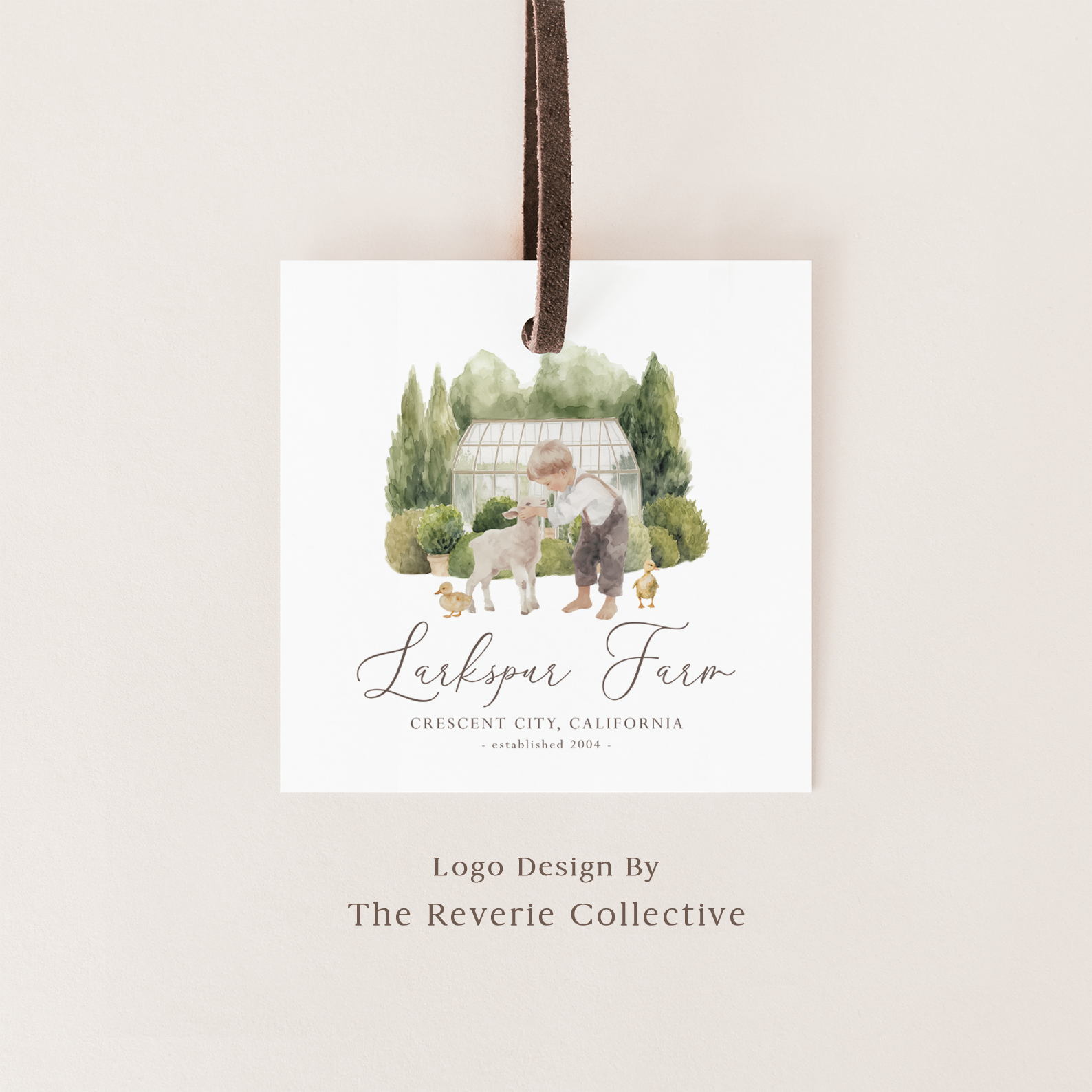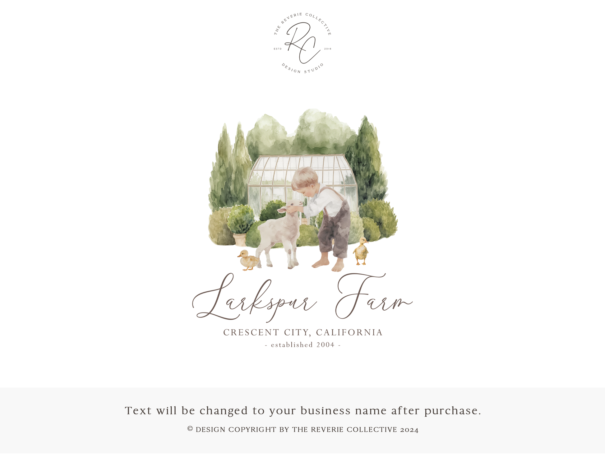 Larkspur Farm | Premade Logo Design | Farm Boy, Baby Lamb, Country Ducklings, Greenhouse