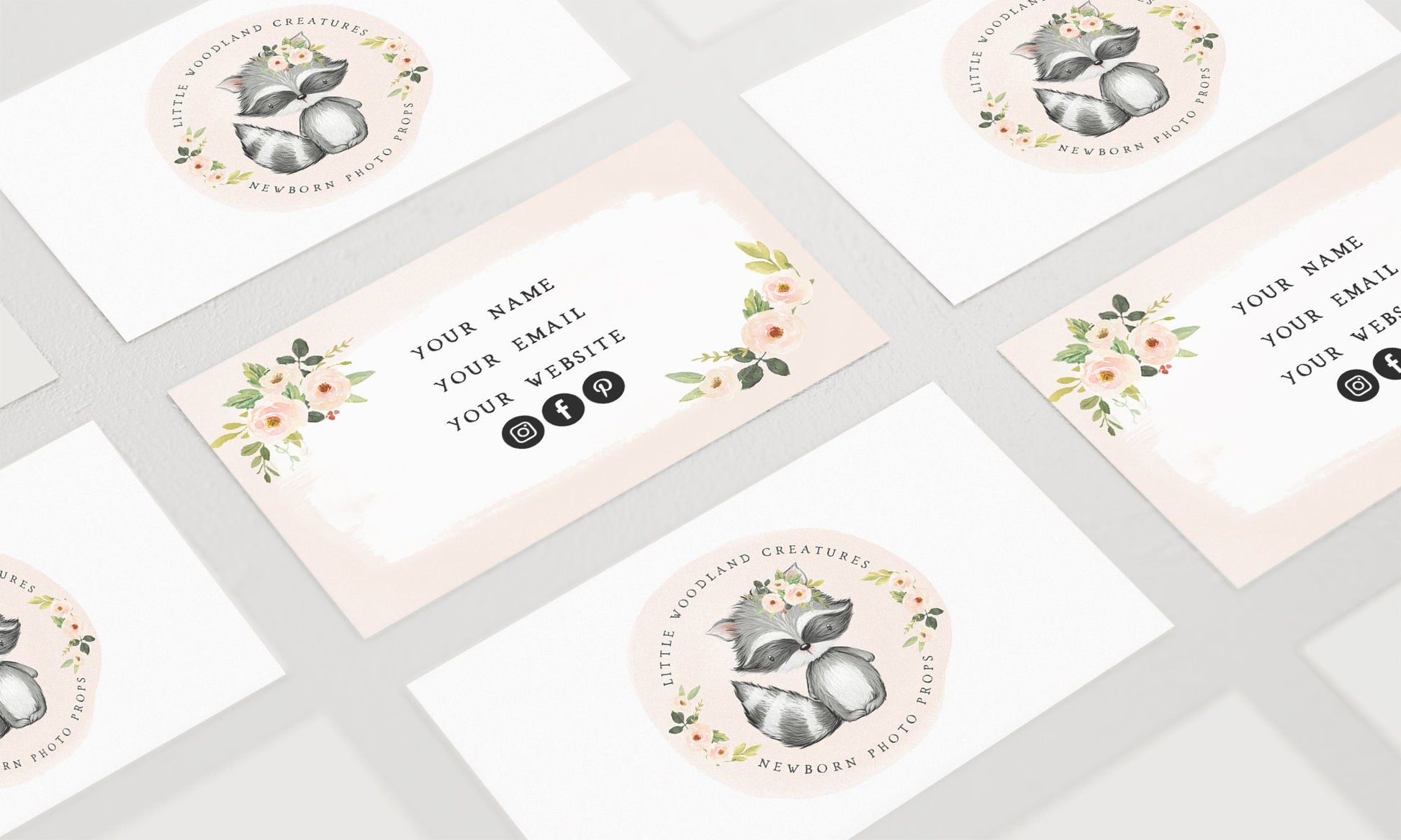 Little Woodland Creatures | Premade Business Card Design | Raccoon, Newborn, Floral