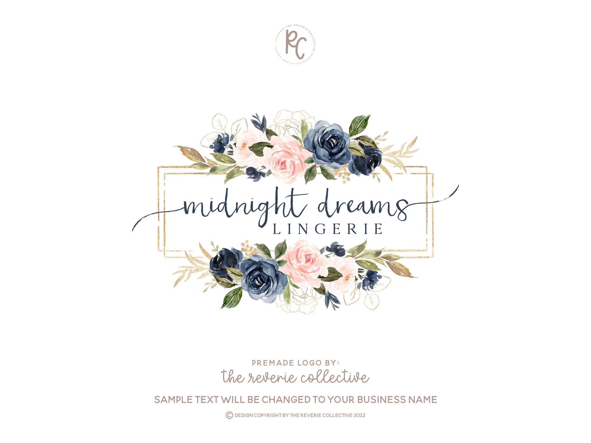 This premade logo design in a navy blush rose bouquet frame style is a quick and affordable way to launch your business in just a few days!