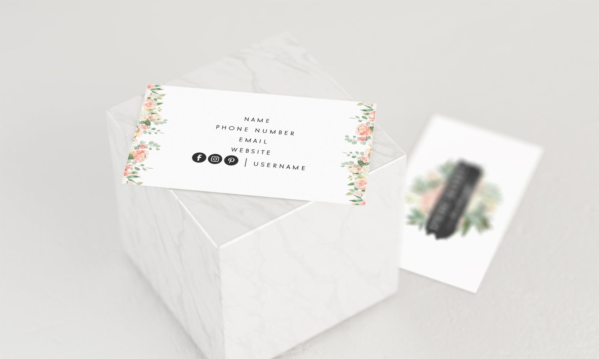 This premade business card design in a farmhouse floral chalkboard wreath style is a quick and affordable way to print out fresh, new business cards either at home or online!