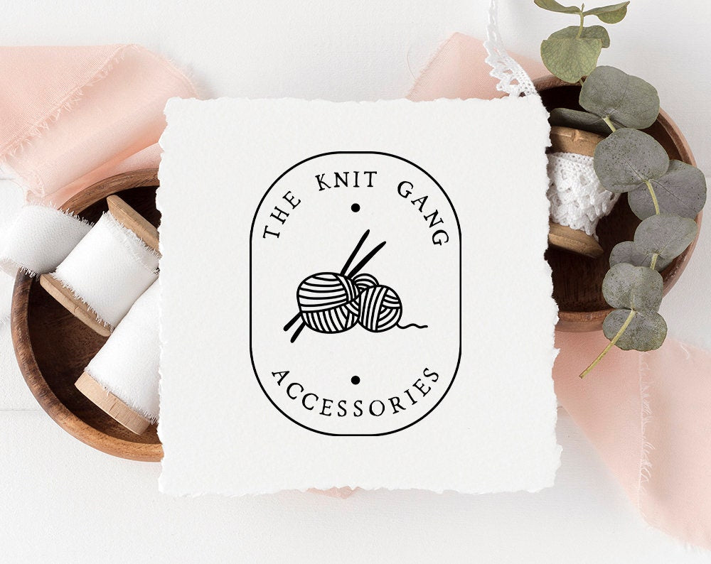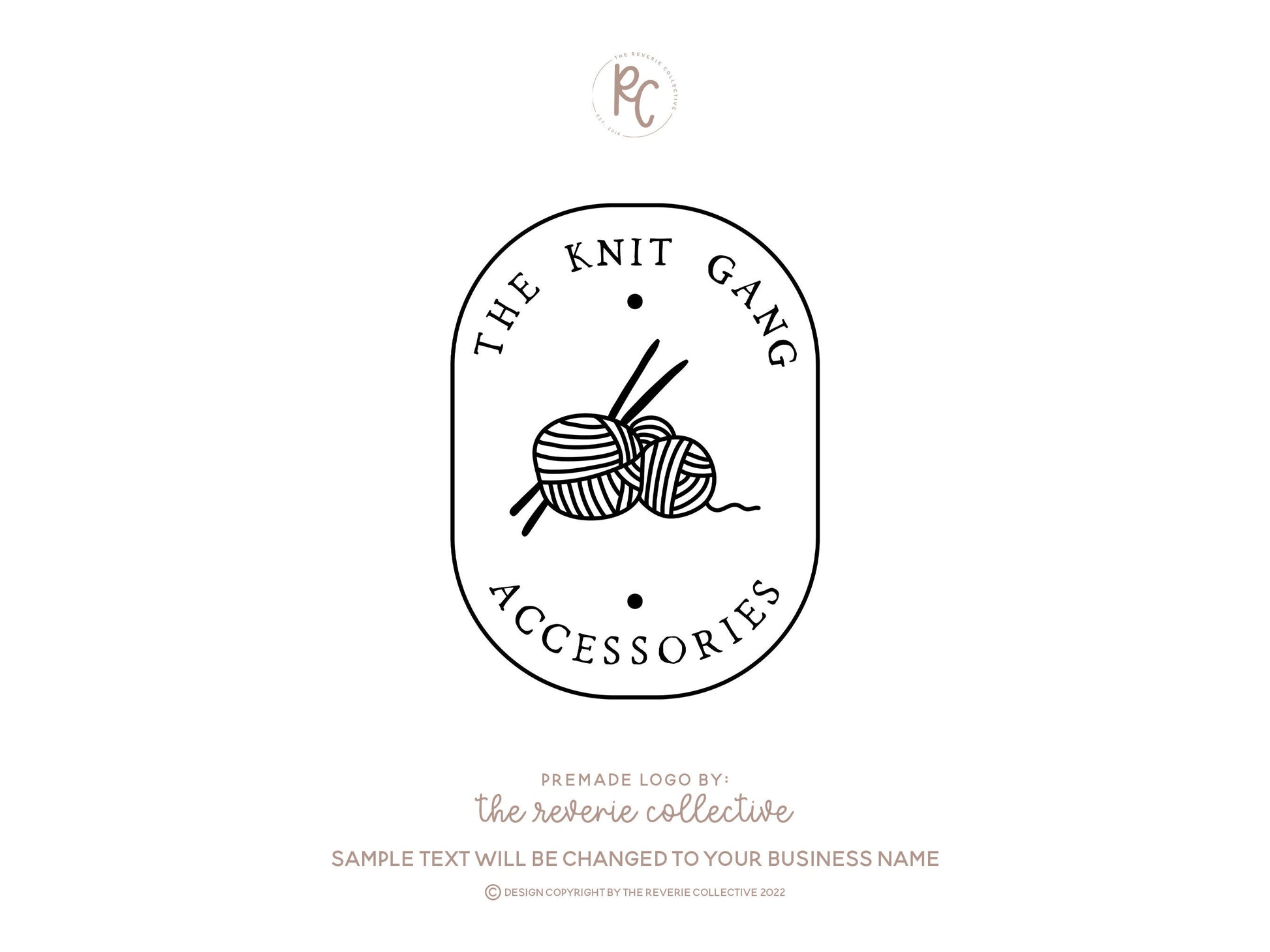 The Knit Gang | Premade Logo Design | Knitting Needles, Yarn, Oval Tag, Hand Drawn