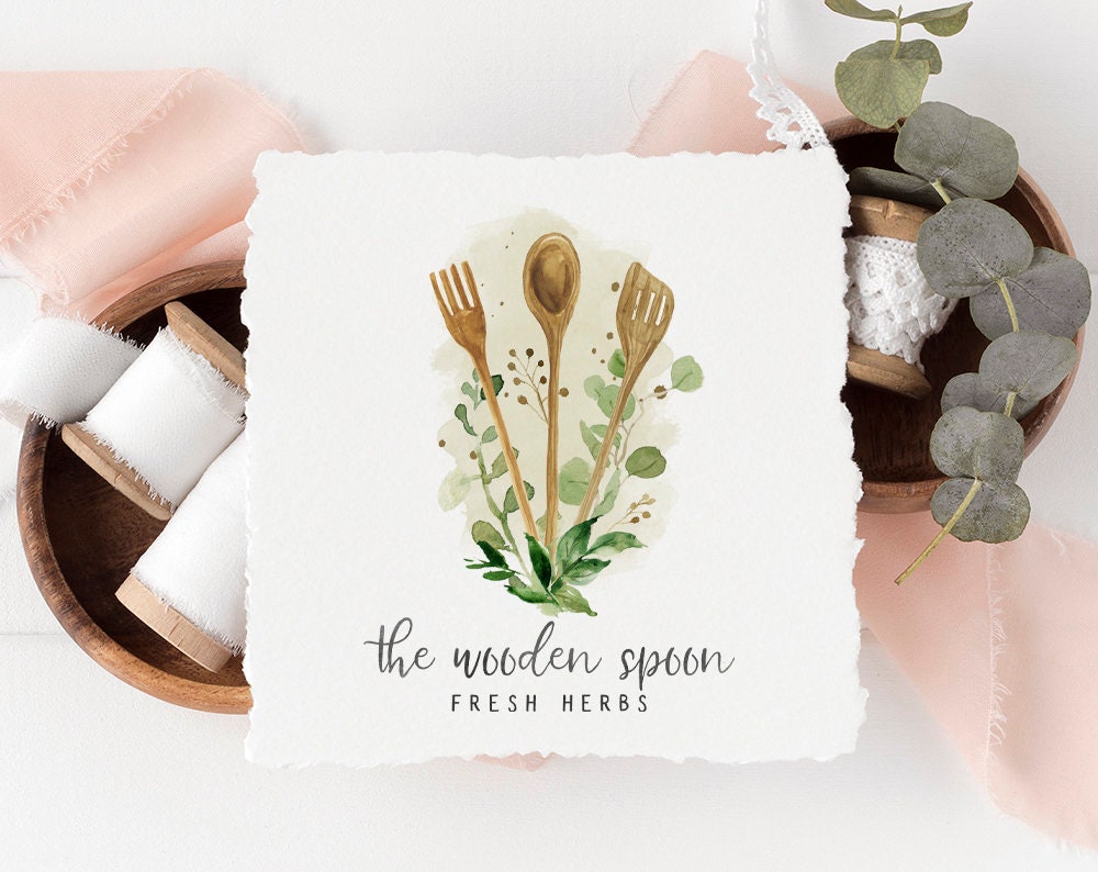 This premade logo design in a watercolor greenery wooden utensils style is a quick and affordable way to launch your business in just a few days!